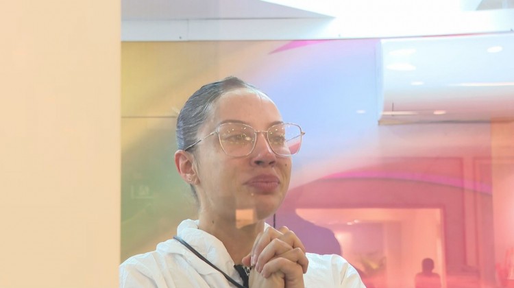 Em uma espécie de casa de vidro, a cearense observa o público se aproximar e , assim que vê Gerusa Pacheco, mãe de Eva, ela cai no choro.